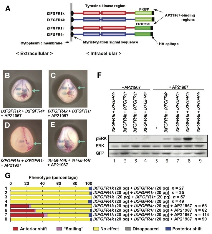 Fig. 6. Heterodimers between the intracellular domains of XFGFR1 and XFGFR4 activate for signaling. (A) Constructs for inducible heterodimerization. (B-D) Heterodimers between XFGFR1-ICD and XFGFR4-ICD as well as homodimers of XFGFR1-ICD shifted Xpax2 expression anteriorly. (E) The positioning of Xpax2 expression was unaffected by AP21967-induced homodimerized XFGFR4-ICD. (F) ERK assay in animal caps injected with different combinations of XFGFR-ICD mRNAs. Dimerization was induced by AP21967 at stage 10. (G) Summary of injections.