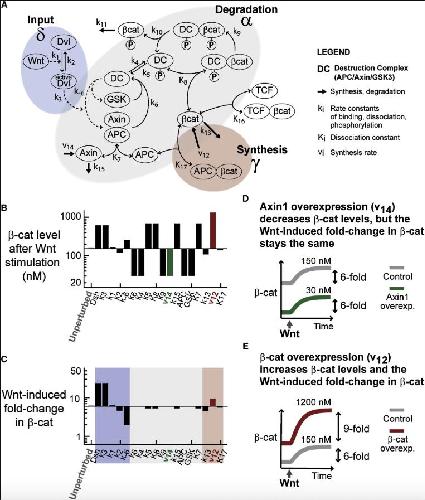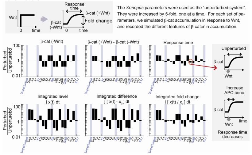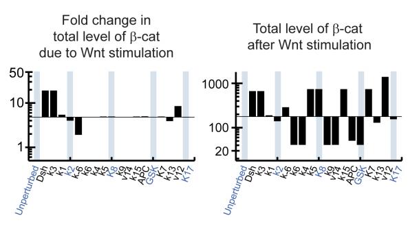 Figure S2. The Insensitivity to Parameters Can Still Be Seen when the Total Pool of β-Catenin (the Measurable Quantity) Is Examined Instead. Same as Figure S1, except that the total pool of β-catenin is plotted here, as opposed to free, un-phosphorylated β-catenin in Figure S1. The total pool of β-catenin is the quantity that can be measured using Western blot. |