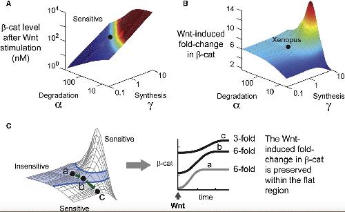 Figure 3. There Is a Region of Parameters where the Wnt-Induced Fold-Change in β-Catenin Is Insensitive to Variation in Parameters (A and B) Analytical solutions for the level of β-catenin after Wnt stimulation (A) and the Wnt-induced fold-change in β-catenin (B). These surfaces were computed analytically using equations 29-30 derived in the Supplemental Data. The black dot denotes the Xenopus parameters (α = 66, γ = 1). (C) The light blue shading indicates the region where the fold-change in β-catenin varies by less than ± 10%. Suppose that the cells reside within this region (point a), and we gradually inhibit degradation (α), thereby moving from point a to b to c. At each point, we stimulate the cells with Wnt, shown in the right panel. The absolute levels of β-catenin vary immediately, but the fold-change in β-catenin is identical for points a and b, which reside within the blue-shaded region. |