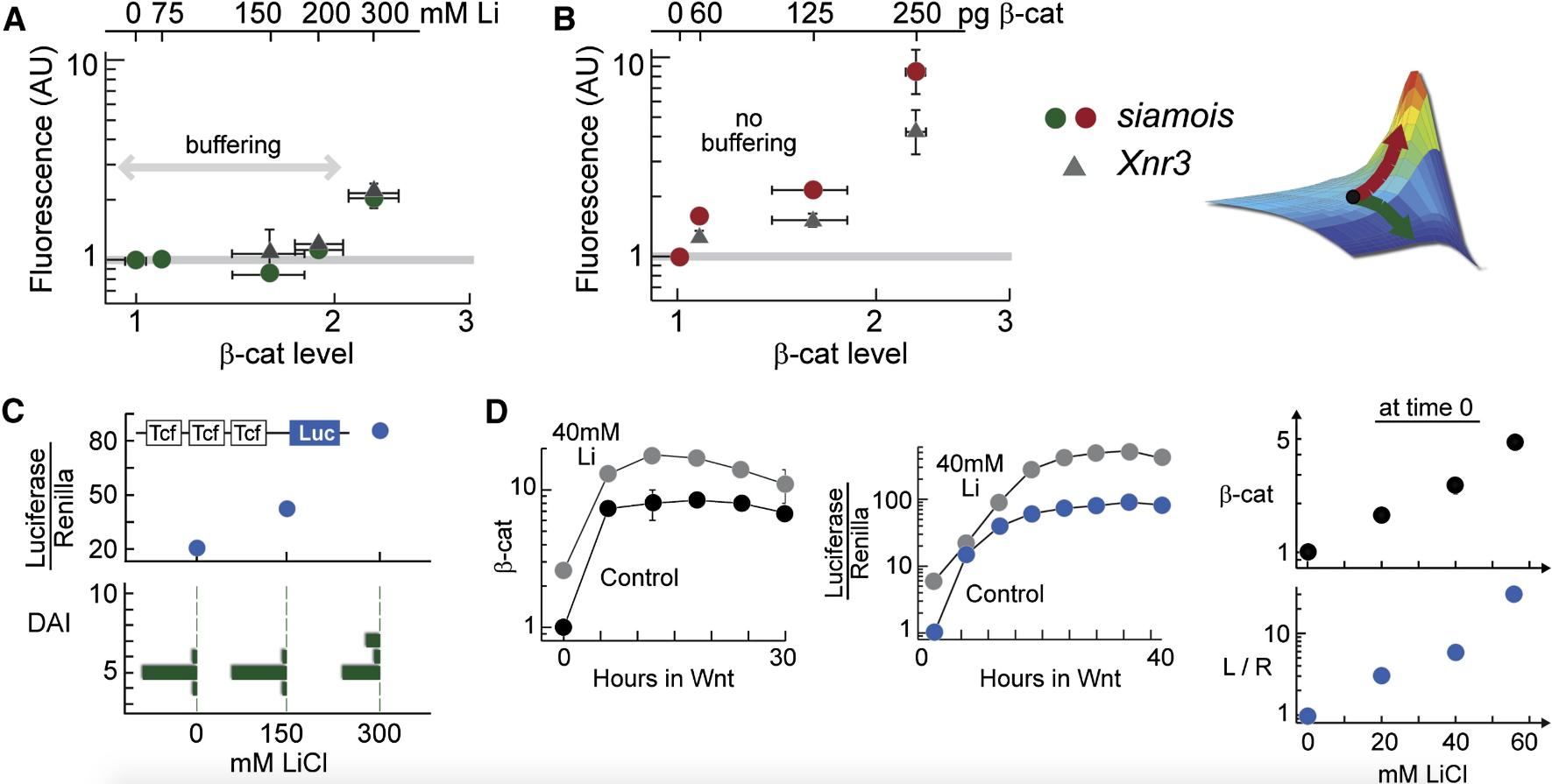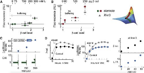 Figure 6. Transcriptional Outcome of Wnt Signaling Is Insensitive to Variations in the Degradation Parameters (A and B) Quantitative RT-PCR analysis of two direct target genes of the Wnt pathway, siamois and Xnr3, in embryos treated with lithium (A) and injected with β-catenin RNA (B). RT-PCR was performed at stage 10. SD = 2â3 measurements. Cadherin-free pool of β-catenin was quantified at stage 8â9 using quantitative western blot. SD = 2â4 blots. (C) Embryos were injected with TopFlash and RL-TK constructs at 4-cell stage and then treated with lithium. Luciferase activity was assayed at stage 10. (D) RKO cells stably expressing BAR reporter and Renilla luciferase (Major et al., 2007) were treated with lithium. β-catenin and luciferase profiles were measured in the same experiment. |