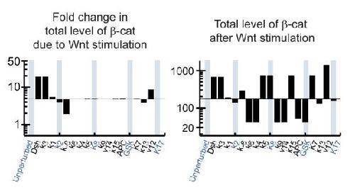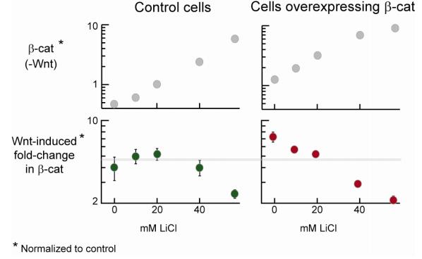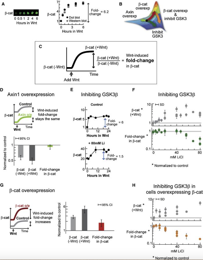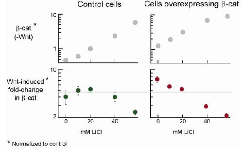 Figure S7. More on Inhibiting GSK3 β in Cells Overexpressing β-Catenin These measurements were performed in the same experiment, side by side. For each data point, 2 biological replicates were examined; SD is the std. dev. from 3 independent dot blots. In the main text, these data are included in Figures 4EG. Here, they are presented side by side to show more directly that: 1) Cells overexpressing β-catenin responded more to Wnt stimulation (i.e., gave a higher fold-change). 2) Cells overexpressing β-catenin were less buffered when treated with lithium (i.e., fold-change decreased more readily). More repeat experiments are shown in the main text. |