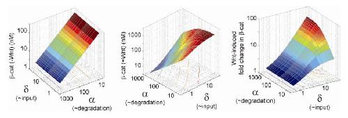 Figure S3. Sensitivity to Ligand Concentration As a control, the basal level of β-catenin is not affected by variations in δ (~ligand stimulation). The Wnt-induced level and fold-change in β-catenin is sensitive to δ. The higher γ (~higher Wnt concentration), the higher the Wnt-induced level of βcatenin, and consequently the fold-change in β-catenin. γ=1 is used in these calculations. |