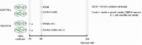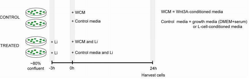 Figure S4. Experimental Protocol of the Inhibitor Treatment RKO cells were pre-treated with different doses of LiCl (0-80mM) for 3h (in growth media). After that, the cells were transferred into control media or Wnt3A-conditioned media (WCM) + 0-80mM lithium. Cells were harvested usually at 24h, lysed, and analyzed using dot blot. β-catenin (-Wnt) = level of β-catenin in cells incubated in control media + 0-80mM lithium. This normally changed little from 0h onward (i.e., the effects of lithium equilibrated rapidly). β-catenin (+Wnt) = level of β-catenin in cells incubated in WCM + 0-80mM lithium after the new plateau in β-catenin was reached. The time to reach the new Wnt-induced plateau varied from ~3h (in untreated cells) to ~20-24h (in cells treated with the highest dose of lithium). It was most efficient to harvest all cells at the same time and it gave the same result as when the cells were harvested as soon as β-catenin reached the new plateau. Wnt-induced fold-change in β-catenin = β-cat (+Wnt) / Basal β-cat (-Wnt) Control media: Using DMEM+serum or L-cell-conditioned media gave the same results. L cell line is the parental line for the L-Wnt3A cell line. Pre-treatment period: 3h or 6h pre-treatment gave the same result. The same protocol was used for BIO treatment. |