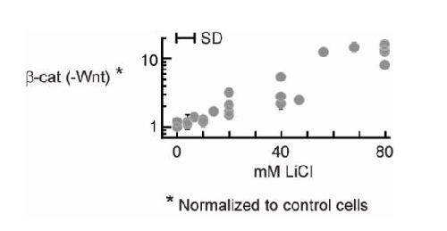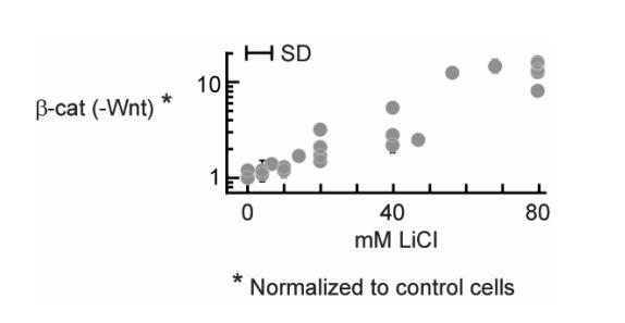 Figure S5. The Basal Level of β-Catenin Increased in a Dose-Dependent Manner with Lithium Treatment RKO cells treated with different doses of lithium showed a dose-dependent increase in the level of β-catenin. Level of βcatenin was quantified using dot blot. The measurements reported here were taken after 24h incubation, but the same results were obtained from measurements at various time points (6h, 12h, 24h). |