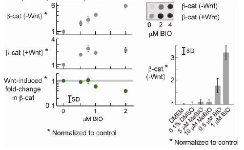 Figure S6. The Wnt-Induced Fold-Change in β-Catenin Is Insensitive to Moderate Doses of BIO (GSK3 β Inhibitor) Cells were pre-incubated with BIO for 3 hours, followed by Wnt treatment in the presence of BIO for 6-24 hours. The level of β-catenin was quantified using dot blot. As a negative control, treatment with DMSO or MeBIO gave no significant changes in the level of β-catenin. |