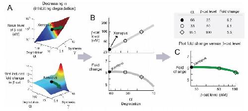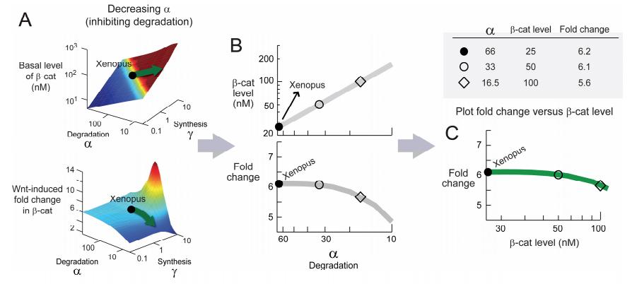 Figure S8. Step-by-Step Details on How Figure 5A Was Generated To illustrate how Figure 5A was generated, let us decrease α from the Xenopus setpoint. As depicted by the green arrow in Figure A, the basal level of β-catenin will increase whereas the Wnt-induced fold-change in β-catenin will remain constant initially. As shown in Figure B, we then plot independently β-catenin level and fold-change as a function of α. Figure C merges the two plots in Figure B. For each value of α, we plot fold-change against basal level. |