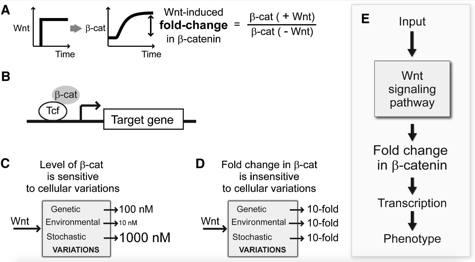 Figure 1. What Is the Cellular Reporter of Wnt Stimulation? (A) Wnt stimulation induces accumulation of β-catenin. (B) Together with the Tcf/Lef transcription factor, β-catenin activates transcription of specific target genes. (C) We found that the absolute level of β-catenin is sensitive to nonspecific variation that may naturally occur in cells. (D) Interestingly, the fold-change in β-catenin induced by Wnt stimulation is buffered against variation in parameters. (E) Together with functional data from Xenopus embryos, we propose that fold-changes in β-catenin, and not absolute levels of β-catenin, are the output of Wnt signaling. |