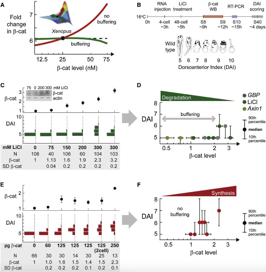 Figure 5. Phenotypic Outcome of Wnt Signaling in Xenopus Patterning Is Insensitive to Perturbations in the Degradation Machinery (A) Model prediction. To facilitate comparison with experimental data, we plot the Wnt-induced fold-change in β-catenin against the basal level of β-catenin. (Please also see Figure S8 to help visualize this.) From the Xenopus setpoint, perturbing degradation (α, green) will vary β-catenin level without initially affecting the Wnt-induced fold-change in β-catenin. However, increasing synthesis (γ, red) will increase both β-catenin level as well as the Wnt-induced fold-change. (B) RNA was injected to all four cells at 4-cell stage. Lithium treatment was performed at 48-cell stage for 5 min. Dorsoanterior phenotype was scored using the DAI index (Kao and Elinson, 1988). Cadherin-free pool of β-catenin was quantified using western blot on stage 8, around the onset of target gene expression. (C) Lithium treatment. (D) Plotting median DAI versus measured level of β-catenin for lithium treatment, GBP RNA injection, and Axin1 RNA injection. (E and F) β-catenin injection. (F) Plotting median DAI versus measured level of β-catenin for β-catenin RNA injection. Note: Phenotypic scoring, β-catenin quantitation, and RT-PCR (in Figure 6) were performed in sibling embryos. SD of β-catenin is from two to four western blots. For more raw data and controls, see Table S1. Sixty percent of the DAI 7/8 embryos developed as Janus twins (Kao and Elinson, 1988). Image in (B) is reprinted from Kao and Elinson (1988). |