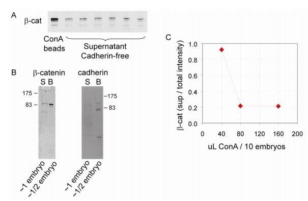 Figure S10. Separating Cadherin-Bound Pool of βCatenin (A) To separate the cadherin-bound pool of β-catenin, a standard protocol was followed (Guger and Gumbiner, 2000; McCrea et al., 1991). 100 uL of embryo lysates (10 embryos) were rotated at 4oC for 1h with 100uL Concanavalin AâSepharose 4B slurry (Sigma C9017). Supernatant and beads were separated by centrifugation (three 5min spin at 16,000g). (B) The supernatant showed trace bands with monoclonal anti-cadherin 6B6 (Hybridoma Bank, 1:500). The 6B6 detects C-/U-/EP-cadherin, the cadherins expressed in early embryos (Heasman et al., 1994). The lower bands (<100kDa) are likely to be cadherin degradation products because they disappear with RIPA-extraction. (C) Calibrating the volume of ConA to use. Equal volumes were loaded for each lane. Ratio does not necessarily correspond to actual membrane/cytoplasmic ratio of β-catenin in the embryo. |