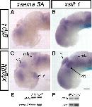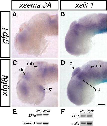 Figure 4. FGF signaling is sufficient to induce xsema3A and xslit1 expression. AâD, Stage 28 embryos were electroporated with pCS2âgfp (gfp) (A, B) or pCS2âgfp and pCS2âxfgf8 (xfgf8; C, D). Twenty-four hours later, embryos were processed for xsema3A (A, C) or xslit1 (B, D) expression by in situ hybridization. Regions of expanded or premature expression are indicated with arrows. E, F, Representative images of the change in xsema3A (E) and xslit1 (F) mRNA levels after gfp and xfgf8 electroporation as assessed by RT-PCR. dd, Dorsal diencephalon; hy, hypothalamus; mb, midbrain; pi, pineal gland. Scale bar, 100 μm. |