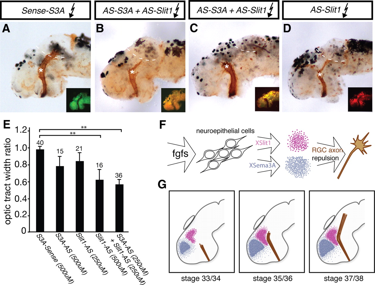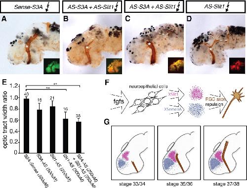 Figure 6. RGC axons fail to navigate beyond the mid-diencephalon when XSema3A and XSlit1 levels are diminished. Fluorescently tagged antisense oligonucleotides targeted to xsema3A and xslit1 mRNA were introduced into stage 28 embryos via electroporation, and, at stage 39, optic tracts were anterogradely labeled with HRP. To maintain fluorescence, brains were not dehydrated and cleared as they were in Figure 2, so tracts appear less distinct. Differences in the thickness of the optic projections is at least in part accounted for by small variations in effectiveness of the HRP-labeling method. A–D, Shown here are embryos electroporated with 500 μM xsema3A-S control (A), 250 μM xslit1-AS plus 250 μM xsema3A-AS (B, C), or 500 μM xslit1-AS (D) oligonucleotides. Insets show distribution of oligonucleotides. A severe arrested-at-turn phenotype is obvious in C, whereas milder arrested-at-turn phenotypes are shown in B and D: at least half of the RGC axons stop at the mid-diencephalic with the remaining axons extending on toward the optic tectum. E, Optic tract widths were measured for pre-turn and post-turn sections of the optic tracts, as described in Figure 2E. A significant decrease in the optic tract width ratio was observed after electroporation with 500 μM xslit1-AS or 250 μM xslit1-AS plus 250 μM xsema3A-AS (S3A-AS) when compared with xsema3A-S (S3A-Sense) electroporated control embryos. F, G, Schematic illustrating model: F depicts FGFs signaling to neuroepithelial cells and promoting expression of xsema3A and xslit1, which go on to guide RGC axons. G, At stage 33/34, XSema3A and XSlit1 are present in advance of incoming RGC axons, and, by stage 35/36, RGC axons can sense these two guidance cues. The repulsive gradient generated by XSema3A and XSlit1 drives RGC axons caudally toward the optic tectum (stage 37/38). Asterisks indicate site of mid-diencephalic turn, and dotted lines indicate approximate rostral boundary of optic tectum. Graph indicates mean ± SEM. **p < 0.01, Newman–Keuls post hoc test. |