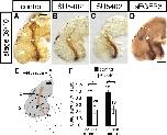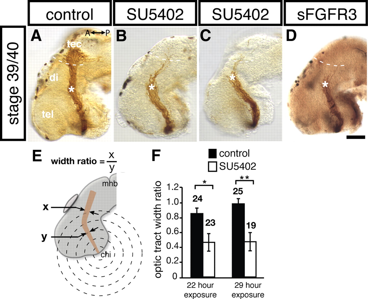 Figure 2. RGC axons terminate in the mid-diencephalon when FGF signaling is inhibited. AâD, Representative examples of whole-mount stage 40 brains in which RGC axons have been labeled with HRP. Stage 33/34 embryos were exposed to control DMSO (A), 100 μM SU5402 solution (B, C), or 20 μg/ml recombinant mouse sFGFR3/IIIc (D). With global inhibition of FGF signaling, most axons stop at the mid-diencephalic turn, and only some grow past en route to the optic tectum. Note that brain in C is mounted slightly ventrally compared with brains in A and B. E, Schematic illustrating optic tract width ratio analysis: 10 evenly spaced concentric rings were overlaid on normalized brains, originating at the chiasm and terminating at the midbrainâhindbrain border (2 easily identifiable morphological landmarks, 5 rings shown here). The width of the optic tract at the third (y) and fifth (x) ring was measured, and the ratio of x/y was calculated for each embryo as an estimate of the number of axons that navigated beyond the turn. F, Average optic tract width ratio for embryos exposed to control DMSO or SU5402 solutions for 22 or 29 h. A significant decrease was observed in the optic tract width ratio after exposure to SU5402 in both the 22 and 29 h exposure groups (NewmanâKeuls post hoc test). There was no significant impact from increased exposure time. Asterisks in AâD indicate the point where RGC axons make caudal turn in mid-diencephalon, and the dotted lines indicate approximate rostral boundary of the optic tectum. Aâ P, Anterior/posterior axis; chi, optic chiasm; di, diencephalon; mhb, midbrainâhindbrain border; tec, optic tectum; tel, telencephalon. Scale bar, 50 μm. Graph depicts mean ± SEM. *p < 0.05, **p < 0.01. |