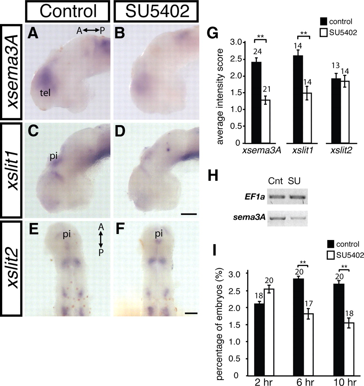 Figure 3. FGF signaling maintains xsema3A and xslit1 expression in the forebrain. AâF, Stage 33/34 embryos were exposed to a control DMSO (A, C, E) or 100 μM FGFR inhibitor (SU5402) (B, D, F) solution for 10 h and then processed for guidance cue expression by in situ hybridization. To best observe expression patterns, embryos were viewed from a lateral perspective for xsema3A (A, B) and xslit1 (C, D) and a dorsal perspective for xslit2 (E, F). Embryos were scored in a blinded manner for intensity of staining from 1 (indicating light staining) to 3 (indicating dark staining). G, Bar graph illustrates the average intensity scores for each riboprobe. Graphs indicate a significant decrease in xsema3A and xslit1 but not xslit2 expression after SU5402 treatment (MannâWhitney rank sum test). H, Representative image of the change in xsema3A mRNA levels after exposure to SU5402 as assessed by RT-PCR. I, Stage 33/34 embryos were exposed to a control DMSO or 100 μM SU5402 solution for 2, 6, or 10 h and then processed for xsema3A expression by in situ hybridization and analyzed as in G. A significant decrease in xsema3A expression was observed after 6 and 10 h of exposure to the inhibitor (Dunn's post hoc method). Aâ P, Anterior/posterior axis; pi, pineal gland; tel, telencephalon. Scale bar, 100 μm. Graphs depict mean ± SEM. **p < 0.01. |