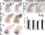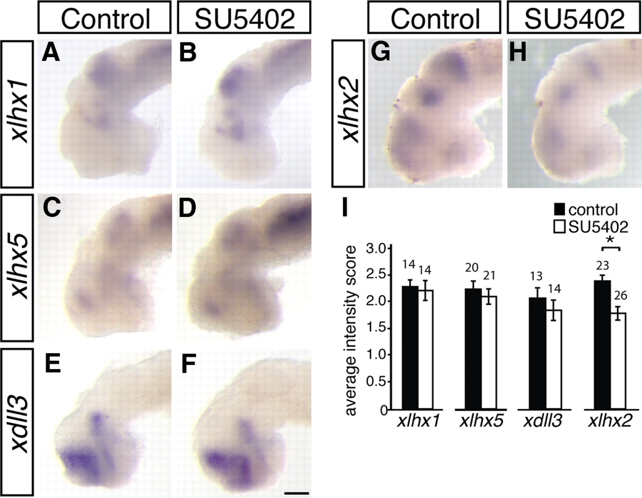 Figure 5. Forebrain map generally maintained after late-stage FGFR inhibition. A–H, Stage 33/34 embryos were exposed to a control DMSO (A, C, E, G) or 100 μM SU5402 (B, D, F, H) solution for 10 h and then processed for xlhx1 (A, B), xlhx5 (C, D), xdll3 (E, F), and xlhx2 (G, H) expression by in situ hybridization. I, Each embryo was photographed and scored in a blinded manner: a score of 1 indicates light staining, and a score of 3 indicates dark staining. The average score for control- and SU5402-treated groups is summarized in the bar graph. No change in xlhx1, xlhx5, or xdll3 expression was observed after exposure to SU5402, but xlhx2 expression was diminished. Scale bar, 100 μm. Graphs show mean ± SEM. *p < 0.01, Mann–Whitney rank sum test. |