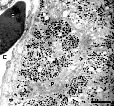 The melanotrope cell in the amphibian pituitary pars intermedia is a model to study fundamental aspects of neuroendocrine integration. They release alpha-melanophore-stimulating hormone (alphaMSH), under the control of a large number of neurochemical signals derived from various brain centers. In Xenopus laevis, most of these signals are produced in the hypothalamic magnocellular nucleus (Mg) and are probably released from neurohemal axon terminals in the pituitary neural lobe, to stimulate alphaMSH-release, causing skin darkening. The presence in the neural lobe of at least eight stimulatory factors implicated in melanotrope cell control has led us to investigate the ultrastructural architecture of this neurohemal organ, with particular attention to the diversity of neurohemal axon terminals and their neurochemical contents. Using regular electron microscopy, we here distinguish six types of neurohemal axon terminal, on the basis of the size, shape and electron-density of their secretory granule contents. Subsequently, we have identified the neurochemical contents of these terminal types by immuno-electron microscopy and antisera raised against not only the 'classical' neurohormones vasotocin and mesotocin but also brain-derived neurotrophic factor, cocaine- and amphetamine-regulated transcript peptide, corticotropin-releasing factor, metenkephalin, pituitary adenylyl cyclase-activating polypeptide, thyrotropin-releasing hormone and urocortin-1. This has revealed that each terminal type possesses a unique set of neurochemical messengers, containing at least four, but in some cases up to eight messengers. These results reveal the potential of the Mg/neural lobe system to release a wide variety of neurochemical messengers in a partly co-ordinated and partly differential way to control melanotrope cell activity as well as ion and water balance regulatory organs, in response to various, continuously changing, environmental stimuli.