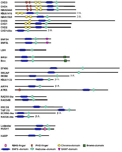 Fig. 1. Overview of the human SNF2-domain family of ATPases. The cartoons of SNF2-domain members represent in each case the longest single database