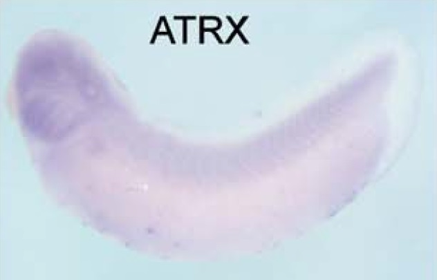 atrx (alpha thalassemia/mental retardation syndrome X-linked) gene expression in Xenopus laevis embryo, assayed via in situ hybridization, NF stage 28, lateral view, anterior left, dorsal up. |
