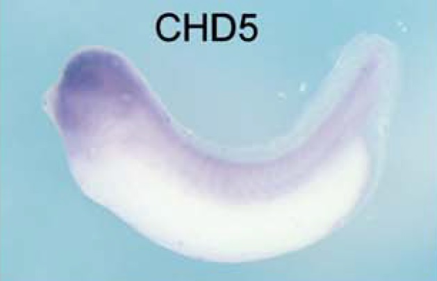 chd3 (chromodomain helicase DNA binding protein 3) gene expression in Xenopus laevis embryo, assayed via in situ hybridization, NF stage 28, lateral view, anterior left, dorsal up. |