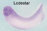 (nc), lens (l) and the head mesoderm (hm) and to a lower extend in th retina (r), but not in heart (h). Panel b shows a blow up of the eye with specific staining in