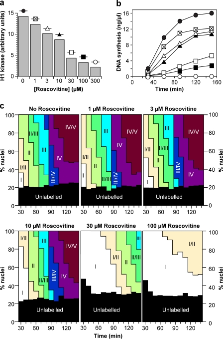 In the metazoan replication timing program, clusters of replication origins located in different subchromosomal domains fire at different times during S phase. We have used Xenopus laevis egg extracts to drive an accelerated replication timing program in mammalian nuclei. Although replicative stress caused checkpoint-induced slowing of the timing program, inhibition of checkpoint kinases in an unperturbed S phase did not accelerate it. Lowering cyclin-dependent kinase (Cdk) activity slowed both replication rate and progression through the timing program, whereas raising Cdk activity increased them. Surprisingly, modest alteration of Cdk activity changed the amount of DNA synthesized during different stages of the timing program. This was associated with a change in the number of active replication factories, whereas the distribution of origins within active factories remained relatively normal. The ability of Cdks to differentially effect replication initiation, factory activation, and progression through the timing program provides new insights into the way that chromosomal DNA replication is organized during S phase.