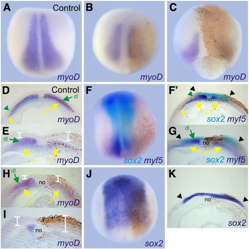Fig. 1. Effects of NotchICD on neural and paraxial mesodermal markers at the neural plate stage. Embryos were injected with 1 ng of notchICD mRNA in one cell at the 2- or 4-cell stage and fixed at neural plate stage (B,C,EâK), when sibling control embryos reached stages 13â14 (A,D). They were revealed by ISH with the following probes: myoD (purple staining in AâE,H,I), myf5 (purple staining in FâG) and sox2 (turquoise staining in FâG; purple staining in J,K). Brown dots correspond to immunolocalization of the Myc-tag epitope fused to NotchICD. All photographs were oriented with the injected side towards the right. (D) Transverse section of the sibling control embryo shown in (A). Two layers are apparent in the paraxial mesoderm: one dorsal, expressing higher levels of myoD transcripts (dl, green arrow) and the other ventral, expressing lower levels of myoD transcripts (vl, yellow arrow). The dotted red line depicts the boundary between both layers and arrowheads point to their lateral limits (green: dl; yellow: vl). (E) Transverse section of an embryo injected with notchICD mRNA. The dorsal layer of paraxial mesoderm appears to be missing from the injected side (right), while the ventral layer remains. (Fâ²) Transverse section of the embryo shown in F. (G) Transverse section of an embryo similar to the one shown in (F). The same references as in (D) are used for the dorsal and ventral layers of the paraxial mesoderm as revealed by myf5 expression. (H) Transverse section of the embryo shown in (B). (I) Transverse section of the embryo shown in (C). White bars in (E,H,I) indicate the thickness of the neural ectoderm. no, notochord. Black arrowheads in (Fâ²,G,K) point to the lateral limits of the sox2 domain. |