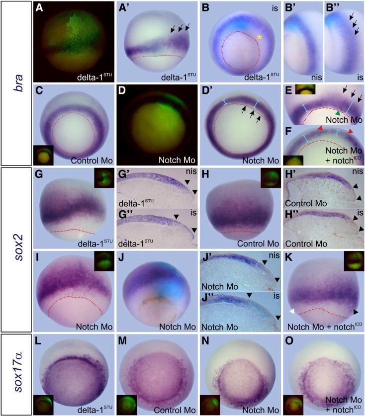 Fig. 4. Blocking Notch signaling produces complementary changes in the expression of markers of the three germ layers at gastrula. Embryos were injected in one cell at the 4-cell stage with 1 ng of deltaSTU mRNA (AâBâ²,GâGâ²,L), 20 ng of Control morpholino (Control Mo; C,HâHâ²,M), 20 ng of Notch Mo (DâE,IâJâ²,N), or with 20 ng of Notch Mo + 1 ng of notchICD mRNA (F,K,O). They were fixed when sibling control embryos reached stage 11 and were revealed by ISH with the following probes: bra(purple staining, AâF), sox2 (purple staining, GâK), sox17α (purple staining, LâO). When possible, embryos hybridized with bra were also revealed with a chd probe to readily identify the dorsal side (turquoise staining in Aâ²âBâ²). All photographs of whole embryos were oriented with the injected side towards the right. is: injected side; nis: non-injected side. Dotted red lines delineate the blastopore. Embryos are shown with the corresponding fluorescence image at the left (A,D for Aâ²,Dâ², respectively) or in the insets, to identify the injected side (green fluorescence), which was revealed by immunofluorescence of GFP (A,G,L), DOG (C,D,E,H,I,M,N) or the Myc-tag epitope fused to NotchICD (F,K,O). (B,CâDâ²,LâO) Vegetal views, with the dorsal side up. (A,Aâ²,E,G,H,I,J,K) Dorsal views. (Bâ²,Bâ²) Lateral views of the non-injected- and the injected side, respectively, of the embryo shown in (B). In this case, photographs were inverted to facilitate comparisons between both sides. This embryo was co-injected with 1 ng of GFP mRNA as tracer, and the injected side was determined by the fluorescence of GFP before the ISH procedure. (D,Dâ² and E) Two different embryos injected with Notch Mo. (Gâ²,Gâ²) Contralateral parasagittal sections of an embryo injected with delta-1STU mRNA + BDA as tracer, which was revealed with BCIP (turquoise staining). (Hâ²,Hâ²) Contralateral parasagittal sections of the embryo injected with Control Mo shown in (H). (Jâ²,Jâ²) Contralateral parasagittal sections of the embryo shown in (J), which was injected with Notch Mo and revealed by immunostaining of the fluorescein epitope with BCIP (turquoise staining). Arrows in (Aâ²,Bâ²,E) point to the animal expansion of the bra domain. The asterisk in (B) indicates an expansion of the gap of unstained cells between the bra+ ring and the blastopore, which correlates with an expansion of the suprablastoporal endoderm (see L for comparison). Arrows in (Dâ²) and the green arrowhead in (E) point to the vegetal expansion of the bra domain. Light blue bars in (Dâ²,E,F) indicate the difference in the width of the bra domain between the injected- and the non-injected side. Notice the stretch of thinner and lower bra staining between the red arrowheads in (F), coinciding with the green fluorescence on the bra domain on the inset, indicating that notchICD reversed the effect of Notch Mo. The black arrowheads in (Gâ²,Gâ²,Hâ²,Hâ²,Jâ²,Jâ²) indicate the distance between the blastopore and the vegetal border of the sox2 domain. The black arrowhead in (K) points to supernumerary sox2+ cells in the marginal zone on the injected side that are not present on the non-injected side (white arrowhead), indicating that notchICD mRNA reversed the effect of Notch Mo on the location of the vegetal boundary of sox2. |