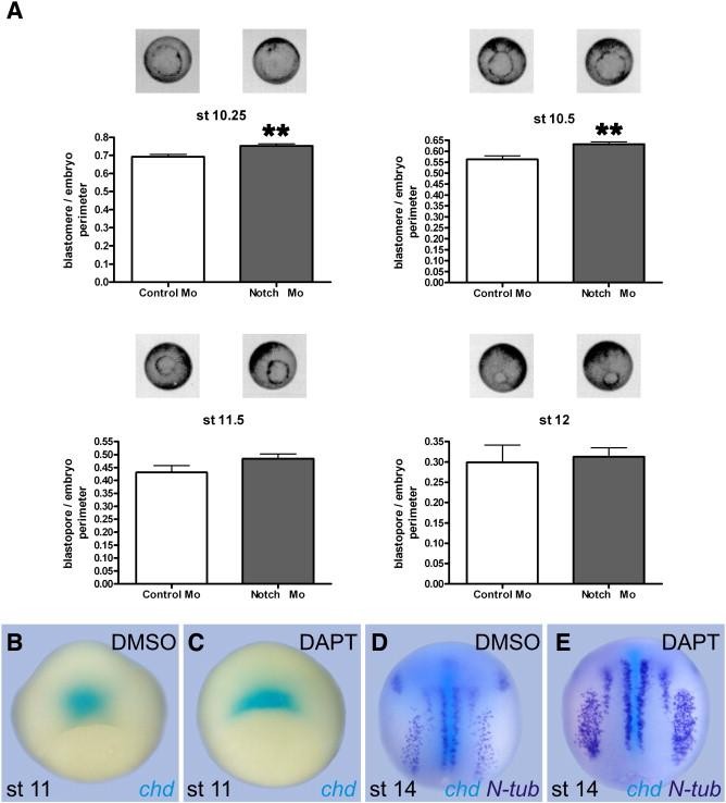 Fig. 5. Blocking Notch signaling impairs morphogenetic movements during gastrulation. (A) Wild type embryos of the same batch and derived from eggs of the same female were injected with 20 ng of Control Mo or with 20 ng of Notch Mo before the first mitotic division. The progress of the blastopore was recorded through gastrulation by scanning the vegetal sides at stages 10.25, 10.5, 11.5 and 12. Data are represented as the ratio between the perimeter of the blastopore and the embryo's perimeter in Notch Mo- (gray bars) and Control Mo- (white bars) injected embryos. Above each bar, an embryo representing the mean of the group is shown. For additional details, see legend to Table 4. This figure illustrates experiment No. 2. (BâE) Embryos of the same batch and derived from eggs of the same female were treated from the 1-cell stage with 100 μM of the γ-secretase inhibitor DAPT or with vehicle alone (DMSO) and fixed at stage 11 (B,C) for ISH of chd (turquoise staining) or at stage 14 for ISH of chd (turquoise staining) and N-tubulin (N-tub, purple staining). |
