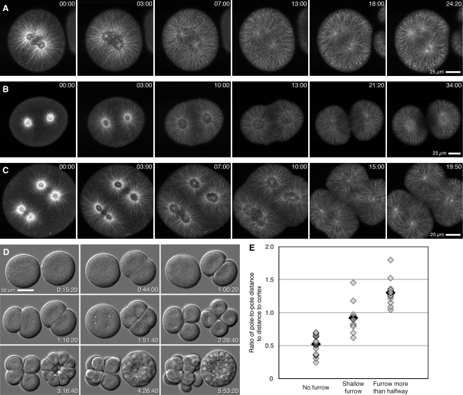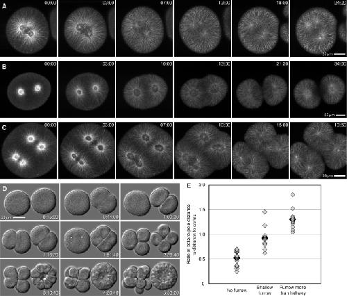 Figure 7. Asters alone induce furrows only if they are far enough apart. (A–C) Single-plane sequences of anucleate, centrosome-containing cytoplasts (sand dollars). (A) Anucleate cytoplast with four centrosomes, two in focus. In normal cells this size, furrowing would begin between 03:00 and 07:00, but no furrow occurs even 20 min later. Centrosomes are closer than the distance to the equator. (B) Anucleate cytoplast with two centrosomes, farther apart than the distance to the equator. A furrow initiates at the expected time and place, and proceeds to completion. (C) An anucleate cytoplast with four centrosomes variously spaced. A deeply ingressing furrow bisects the well-spaced centrosomes; shallow furrows form over closely spaced centrosomes. Time is indicated in minutes:seconds. (D) Long-term differential interference contrast sequence of two halves of a bisected sand dollar zygote. The film began shortly after the unbisected zygote would have divided; because each half has only one centrosome, neither divided at first mitosis. All subsequent divisions proceeded normally in the nucleated half (right), creating a perfect blastula. The anucleate half cleaved abortively in its first attempt. After that, four centrosomes (dots in the 1:51:40 frame) were variously spaced. The second attempt made deep furrows between the widely separated asters, but none between the closely spaced pair. Subsequent divisions were variously successful. Time is indicated in hours:minutes:seconds. (E) Aster separation strongly correlates to the furrow extent. See Materials and methods for measurement. Video 6 corresponds to A–C. |