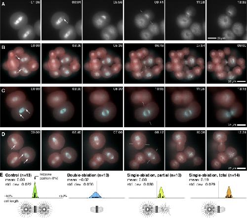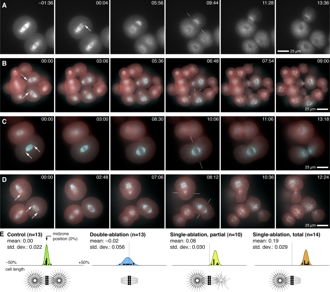 Figure 8. Centrosome ablation displaces furrows. (A–D) Single-plane recordings of sand dollar embryos expressing EMTB-3G alone (A) or GFP-rGBD (red) and 3C-EMTB (cyan; B–D); time is shown in minutes:seconds after last irradiation. Arrows, ablation sites; dotted lines, furrow plane. (A) Single-pole ablation in a moderately large cell. Few astral microtubules remain; furrowing occurs over the spindle end rather than the midzone (see Video 7). (B) Two single-pole ablations. Furrows form over and close upon the ablated end. In the top cell, chromosomes are partitioned by the furrow; in the bottom cell, they are not. Rho activity zones in ablated cells are similar to normal cells but shifted. (C) Double-pole ablation in a large cell. A broad furrow with barely detectable Rho activity forms above the spindle midplane and closes between spindle halves. (D) A normal cell (left), singly ablated cell (top), and doubly ablated cell (right). The furrow in the doubly ablated cell is broad, with dilute Rho activity, but closes accurately. The furrow in the singly ablated cell is shifted away from the midplane. (E) Distances (percentage of cell length) between spindle midplane and furrow plane in control, double-, and single-ablated cells (dots) superimposed upon normal curves computed from mean and standard deviation. Video 9 corresponds to B–D. |