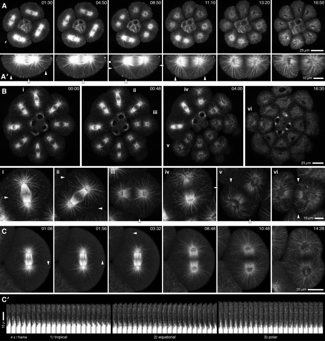 Figure 1. Microtubules in live urchin embryos. All panels show single confocal sections. (A and A′) 16-cell purple urchin embryo; A′ shows a 2× enlarged view of the lower cell (indicated by white mark in A). Microtubules approach the cortex everywhere before anaphase onset (1 min, 30 s); during anaphase, just before furrowing, many astral microtubules penetrate both polar and equatorial cortex (arrowheads in A′). (B) Vegetal view, 28-cell sand dollar embryo; i–vi are 2× enlarged views as indicated. Astral microtubules frequently cross spindle midplane before and during anaphase (i–iii), approach within 1 µm of the equatorial surface before furrowing (ii–iv), and curve inward as the furrow ingresses (v and vi). Arrowheads point to exemplars. (C) Eight-cell sand dollar embryo; single microtubules grow as far as the cell surface in all directions (equatorially in the 01:56 frame, tropically in the 01:08 frame, and toward the pole in the 03:32 frame). Astral microtubules reach the polar cortex most densely in anaphase (08:48) but also reach the equator before furrowing (frame 10:48). (C′) Enlargement of successive frames for microtubules indicated by arrowheads in C (intensities squared to enhance contrast). Video 1 corresponds to A–C. Time is indicated in minutes:seconds. |