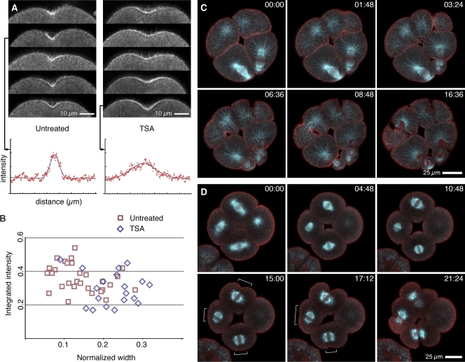 Figure 6. Active Rho occupies a wider-than-normal zone in asterless cells. (A) GFP-rGBD at similar stages of furrowing in control (left) and TSA-treated (right) purple urchin embryos; single confocal sections. Rho zones are broader and fainter in TSA-treated cells compared with untreated siblings, but zones are centered equatorially and match furrows. Plots show representative fits between intensity data (red) and a fit curve (blue) that measures zone width along the cell outline (see Materials and methods). (B) Measured zone widths normalized by pole-to-pole cell length, plotted against integrated intensity, minus baseline, within the curve fit as shown in A, expressed as a fraction of baseline. (C) Normal Rho zones, eight-cell purple urchin embryo (red, GFP-rGBD; cyan, 3C-EMTB). (D) Eight-cell purple urchin embryo (same probes as C) treated with 20 µM TSA at time 00:00. Uniform cortical Rho activity during metaphase (00:00) disappears as cells enter anaphase, as in normal cells (Bement et al., 2005). Rho zones (brackets) are barely detectable above background, yet furrows develop and complete with minor delay (compare times in C), which implies that cells normally express more equatorial Rho activity than they require. Time is indicated in minutes:seconds. |