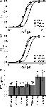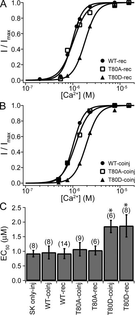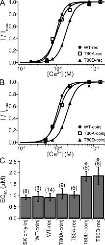Figure 3. SK channels recovered with CaM (T80D) have reduced apparent Ca2+ affinity. (A) Representative dose–response relationships for SK channels recovered with CaM (WT) (filled circles), CaM (T80A) (open squares), and CaM (T80D) (filled triangles). In all cases, patches were excised from oocytes coinjected with RNA for SK channels and CaM (E/Q). Currents were allowed to run down before the application of 20 µM of individual types of CaM. Dose–response relationships were measured in CaM-free solutions. Solid lines are fits with the Hill equation (WT, EC50 = 0.97 µM and h = 3.8; T80A, EC50 = 1.03 µM and h = 3.0; T80D, EC50 = 1.82 µM and h = 3.4). (B) Representative dose–response relationships for SK channels coexpressed with CaM (WT) (filled circles), CaM (T80A) (open squares), or CaM (T80D) (filled triangles). Solid lines are fits with the Hill equation (WT, EC50 = 1.03 µM and h = 3.7; T80A, EC50 = 1.14 µM and h = 3.1; T80D, EC50 = 1.93 µM and h = 3.3). (C) Average values for EC50 from experiments as shown in A and B. Dose–response relationships were individually fitted for each experiment. Error bars represent standard deviation. Trial numbers are shown in the brackets on the top. Labeling is interpreted as the following: SK only-inj, oocytes were injected with SK RNA alone; WT-coinj, CaM (WT) RNA was coinjected with SK RNA; WT-rec, SK channels recovered by CaM (WT) in patches from oocytes coinjected with RNA for the SK channel and CaM (E/Q). The same applies for CaM (T80A) and (T80D). EC50 values for T80D-rec and T80D-coinj are not significantly different from each other (P > 0.05; Student's t test), but significantly different from all other columns (P < 0.01), and are therefore labeled with stars. All other columns are not significantly different from each other (P > 0.05).