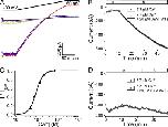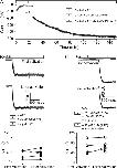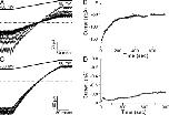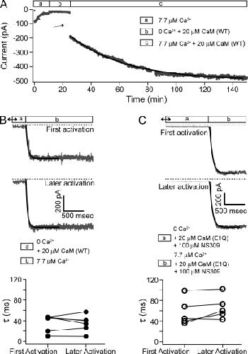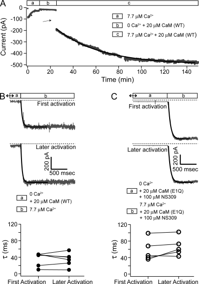 Figure 5. Recovery of SK channels in the absence of Ca2+. (A) Time course of the average current level at −80 mV with a patch from an oocyte coexpressing SK channels with CaM (E1Q). Solid line is a single-exponential fit with a τ = 39.1 min. (B) After patch was excised from an oocyte expressing SK channel and CaM (E1Q), current ran down to 60 pA before the patch was subjected to 20 µM CaM (WT) in Ca2+-free solution for 60 min. Then, recording pipette was quickly moved into a laminar flow of solution containing 7.7 µM Ca2+ to measure the time course of activation. Current was continuously recorded at −80 mV during the movement and shown in the top panel. Later in the experiment, pipette was moved back to Ca2+-free solution and then to 7.7 µM Ca2+ again (middle). Solid lines are fits of data with a single-exponential time course (top, τ = 46 ms; middle, τ = 38 ms). The bottom panel compares the time constants for the first activation after recovery to the average values for later activations. Results were from six similar experiments. (C) Similar experiment as in B, except that CaM (WT) was replaced by 20 µM CaM (E1Q) plus 100 µM NS309, which were also present during the measurement of the activation time course. Before the application of Ca2+-free solution containing CaM (E1Q) and NS309, there was 18 pA of residual current after rundown. Solid lines are fits of data with a single-exponential time course (top, τ = 70 ms; middle, τ = 66 ms). Data from five similar experiments are shown in the bottom panel as in B.