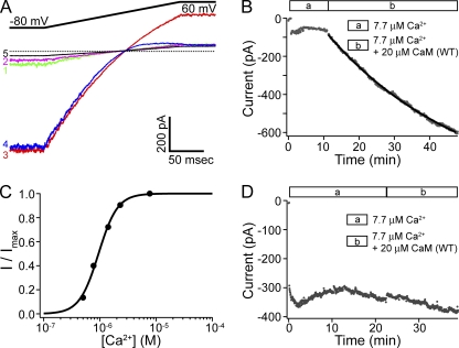 Figure 2. CaM (WT) can recover SK channel activity. (A) Representative current traces with a patch from a CaM (E2Q)–coinjected oocyte at the following time points: (1) immediately after patch excision; (2) after rundown stabilized; (3) 50 min after the application of 20 µM CaM (WT); (4) the application of solution containing 16 µM Ba2+; and (5) finally in Ca2+-free solution. (B) Average current level at −80 mV measured every 3 s with the patch shown in A during the course of rundown and recovery. Legends in this and later figures show the different solutions that the patch is subjected to. Solid line represents fit with a single-exponential time course (τ = 39.7 min). (C) With the same patch shown in A and B, after recovery of SK channel activity with CaM (WT), solutions containing different free Ca2+ concentrations were applied to the patch. Average current level at −80 mV was measured at each concentration, normalized to the maximal value, and plotted as a function of Ca2+ concentration. The dose–response relationship is fitted with the Hill equation: I/Imax = 1/(1+(EC50/[ Ca2+])h), yielding EC50 = 0.94 µM and h = 2.6. (D) A representative time course of the average current level at −80 mV with a patch excised from an oocyte coinjected with RNA for SK channels and CaM (WT).