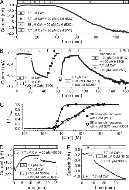 Figure 4. CaM (E/Q) can only recover SK channel activity in the presence of NS309. (A) Time course of the average SK current level at −80 mV with a patch excised from an oocyte coexpressing SK channels and CaM (E2Q). Patch was subjected to solutions containing different amount of Ca2+ and 20 µM WT or mutant CaM as shown by the legend. (B) Time course of the average SK current level at −80 mV with a patch from an oocyte coexpressing SK channels and CaM (E1Q). (C) A representative dose–response relationship for SK channels recovered with CaM (E2Q) and NS309 in a patch from an oocyte coexpressing SK channels and CaM (E2Q) (open circles). Initial currents were allowed to run down before the application of 20 µM CaM (E2Q) and 100 µM NS309. After recovery, the dose–response relationship was measured in the presence of 20 µM CaM (E2Q) and 100 µM NS309. Dashed line represents a fit of the data with a single Hill equation (EC50 = 0.41 µM and h = 1.0). Solid line represents a fit of the data with a two-component Hill equation, I/Imax = c/(1+(EC50a/[ Ca2+])ha) + (1−c)/(1+(EC50b/[Ca2+])hb), in which c is the fraction of the first component (c = 0.41, EC50a = 90 nM, and ha = 2.9; EC50b = 1.14 µM and hb = 1.9). Filled circles are a representative dose–response relationship in the presence of 100 µM NS309 for CaM (WT)–recovered SK channels. Solid line is a fit with a single Hill equation (EC50 = 69 nM and h = 4.2). (D) A representative experiment where NS309 was applied in the absence of CaM to a patch from an oocyte coexpressing SK channels with CaM (E/Q). (E) An example of recovery using CaM (E1Q) and NS309 without pretreatment with CaM (E1Q) alone.