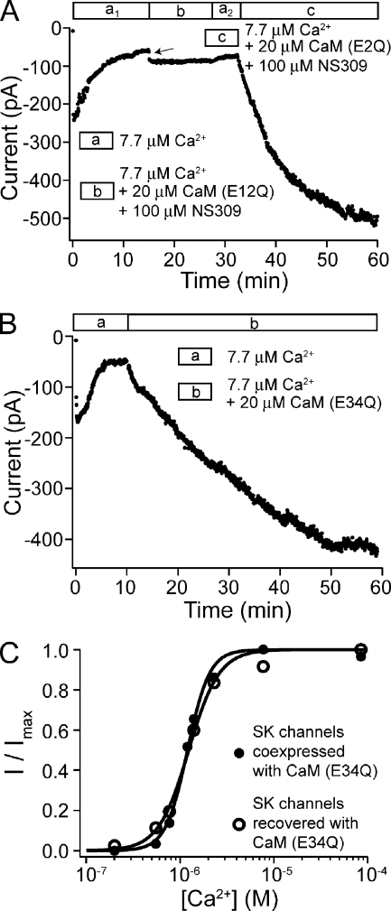 Figure 6. CaM (E34Q), but not CaM (E12Q), can recover SK channel activity. (A) Time course of the average current level at −80 mV with a patch from an oocyte coexpressing SK channels with CaM (E2Q) while the patch was subjected to different solutions as indicated by the legend. (B) Time course of the average current level at −80 mV with a patch from an oocyte coexpressing SK channels with CaM (E2Q). (C) Dose–response relationship for the patch shown in B was measured after recovery of SK channels with CaM (E34Q) (open circles). Solid line is a fit with the Hill equation (EC50 = 1.24 µM and h = 2.7). Filled circles represent the dose–response relationship measured with a patch from an oocyte coexpressing SK channels with CaM (E34Q) fitted with the Hill equation (EC50 = 1.20 µM and h = 3.7).