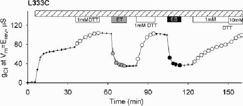Figure 2. Functional impact of covalent labeling of L333C CFTR was charge-independent. After activation by isoproterenol and IBMX, exposure to either 1 mM MTSET+ or 1 mM MTSES− produced a substantial inhibition of conductance.