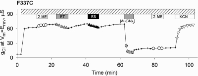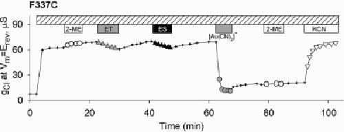 Figure 3. Selective reactivity of F337C CFTR. Exposure of an oocyte to 1 mM MTSET+ or 1 mM MTSES− resulted in small, reversible reductions of conductance. In some experiments, no change in conductance was seen after exposure to these reagents. Subsequent exposure of the oocyte to [Au(CN)2]− (1 mM) produced a profound inhibition of conductance that was only slightly reversed by removing [Au(CN)2]− from the perfusate. Inhibition was not reversed by 1 mM 2-ME but was reversed by exposure to 1 mM KCN.