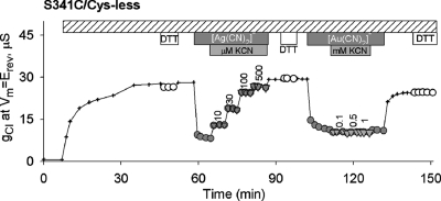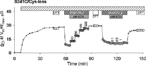 Figure 4. Differential reactivity of S341C/Cys-less CFTR toward [Ag(CN)2]− and [Au(CN)2]−. Inhibition of conductance by [Ag(CN)2]− (100 μM) was reversed by adding KCN in the continued presence of [Ag(CN)2]−, indicative of a ligand exchange or ligand addition reaction. In contrast, inhibition by [Au(CN)2]− (1 mM) was unaffected by adding KCN as expected for lyotropic block.