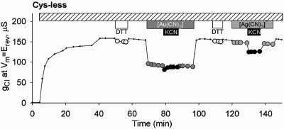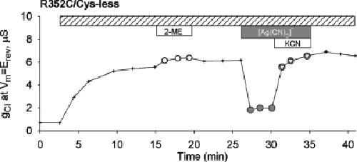Figure 5. R352C/Cys-less CFTR was reactive toward [Ag(CN)2]− (1 mM) as judged by reversal of inhibition by adding KCN (1 mM) in the continued presence of [Ag(CN)2]−.