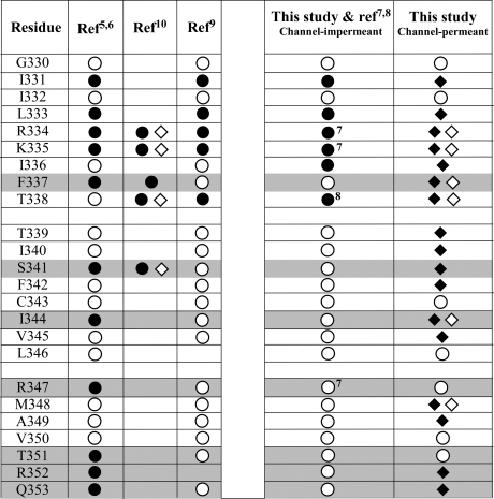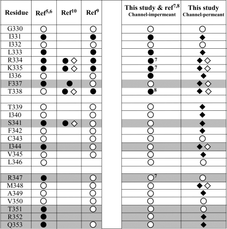 Figure 8. Summary of the results of previous cysteine-scanning studies of TM6 of the CFTR chloride channel compared to the present study. Note the lack of consistent results reported for F337C, S341C, I344C, R347C, T351C, R352C, and Q353C (shaded). ● = sites where reactivity with channel-impermeant probes was inferred. ◆ = sites where reactivity with [Ag(CN)2]− was inferred. ◇ = sites where reactivity with [Au(CN)2]− was inferred. ○ = sites scored as nonreactive. Superscripts refer to bibliographic references.