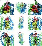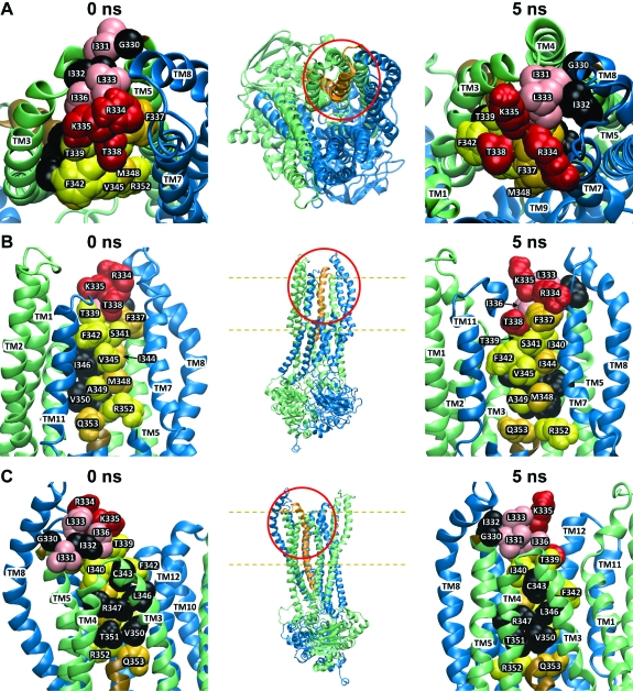 Figure 6. Three views of two models of the CFTR pore based on Sav1866 and a 5 ns molecular dynamics simulation. Insets show the portion of the protein that is enlarged in each panel, and dashed lines indicate the approximate boundaries of the lipid bilayer. Also, the contains two movies that offer an overall view of the two models. Cytoplasmic domains have been removed from the enlarged views. (A) Top view looking “down” into the pore from the extracellular side. (B) Side view with TMs 9, 10, and 12 partially removed to reveal the “pore-lining” face of TM6. (C) Side view from behind the TM3−4 loop. Residues indicated in black are those where substituted cysteines were unreactive with any of the probes employed in this study. Residues colored in red and pink represent sites where thiol reactivity was detected toward both channel-permeant and channel-impermeant, thiol-directed reagents. The pink residues are sites where the resulting functional effects were charge-independent, whereas those in red represent sites where functional effects were distinctly charge-dependent. Residues colored in yellow and orange represent those sites where cysteines reacted exclusively with permeant reagents, [Ag(CN)2]− and [Au(CN)2]−. [Ag(CN)2]− reacted at all of these sites while [Au(CN)2]− reacted only at those labeled in orange. All molecular representations were generated using “Visual Molecular Dynamics” (vmd) (54).