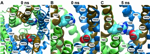 Figure 7. Views of R352 and its relation to D993 in the 1 and 5 ns molecular models. Atom coloring is carbon = cyan, nitrogen = blue, white = hydrogen, and red = oxygen. (A) View from the top of a cross section of the pore (0 ns model) showing that both R352 and D993 side chains are predicted to project into the pore. (B, C) Side views showing the change in relative position of the two residues in the 0 and 5 ns models. It can be seen that the nitrogen on the arginine side chain and the oxygen on the aspartate side chain move closer in the 5 ns model.
