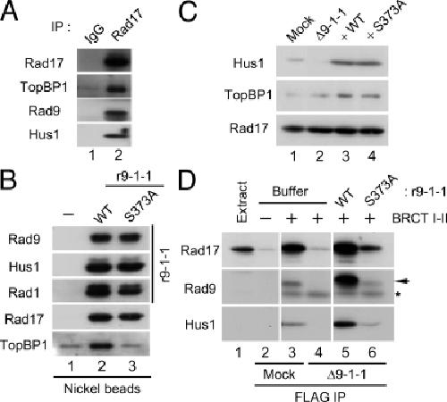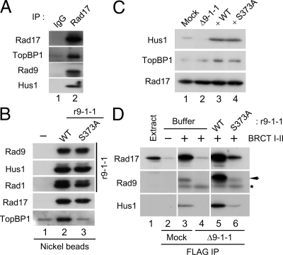 Figure 1. Binding of TopBP1 to the Rad17/9-1-1 complex is dependent on Ser373 of Rad9. (A) Control IgG (lane 1) and anti-Rad17 antibodies (lane 2) were used for immunoprecipitation of egg extracts. Associated proteins were examined by immunoblotting with indicated antibodies. (B) Recombinant 9-1-1 complexes containing WT His6-Rad9 (r9-1-1-WT, lane 2) or the S373A mutant form of His6-Rad9 (r9-1-1-S373A, lane 3) were incubated in interphase egg extracts. Control buffer was added in lane 1. Nickel agarose beads were incubated in the extracts, retrieved, and immunoblotted for the indicated proteins. (C) Mock-depleted (lane 1) and 9-1-1–depleted extracts supplemented with buffer alone (lane 2), r9-1-1-WT (lane 3), or r9-1-1-S373A (lane 4) were immunoblotted for Hus1 (to monitor the 9-1-1 complex), TopBP1, and Rad17. (D) Mock-depleted extracts (lanes 2 and 3) and 9-1-1–depleted extracts supplemented with buffer alone (lane 4), r9-1-1-WT (lane 5), or r9-1-1-S373A (lane 6) were prepared and incubated for 1 h with anti-FLAG antibody beads in the absence (lane 2) or presence of the FLAG-tagged BRCT I–II fragment of TopBP1 (lanes 3–6). The beads were retrieved, and associated proteins were examined by immunoblotting with indicated antibodies. Anti-Rad9 antibodies detected Rad9 (arrow) as well as the cross-reacting BRCT I–II band (asterisk). Lane 1 depicts 1.5 μl of initial egg extract. |