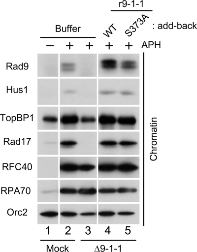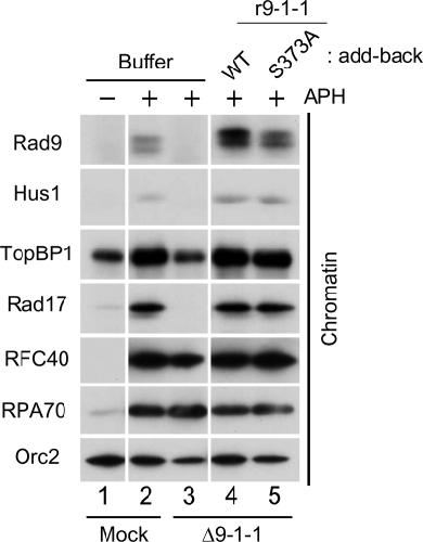 Figure 4. Rad17/9-1-1 complex but not phospho-Ser373 of Rad9 is required for the checkpoint-related accumulation of TopBP1 at stalled replication forks. Mock-depleted extracts (lane 1 and 2) and 9-1-1–depleted extracts supplemented with buffer alone (lane 3), r9-1-1-WT (lane 4), or r9-1-1-S373A (lane 5) were incubated with sperm chromatin in the absence (lane 1) or presence of aphidicolin (lanes 2–5). Chromatin fractions were isolated and immunoblotted with the indicated antibodies. |