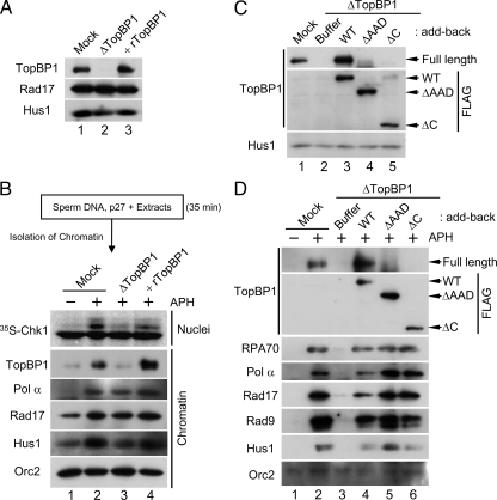 Figure 5. Initial binding of the N-terminal half of TopBP1 to chromatin is sufficient for the formation of replication forks. (A) Mock-depleted extracts (lane 1) and TopBP1-depleted extracts supplemented with buffer alone (lane 2) or rTopBP1 (lane 3) were immunoblotted for the indicated proteins. (B) Sperm chromatin was isolated after a 35-min incubation in egg extracts in the presence of 2 μM p27. Next, the p27-treated chromatin was transferred to mock-depleted extracts (lanes 1 and 2) or TopBP1-depleted extracts supplemented with buffer (lane 3) or rTopBP1 (lane 4). Extracts were incubated in the absence (lane 1) or presence of aphidicolin (lanes 2â4). Aliquots of the extracts were incubated with 35S-Chk1. Nuclear fractions from these incubations were processed for phosphorimaging (top panel). Other aliquots were processed for isolation of chromatin fractions and immunoblotting with indicated antibodies (bottom panels). (C) Mock-depleted extracts (lane 1) and TopBP1-depleted extracts supplemented with buffer (lanes 2) or the indicated versions of recombinant TopBP1 (lanes 3â5) were immunoblotted with anti-TopBP1 (top), anti-FLAG (middle), and anti-Hus1 antibodies (bottom). (D) Chromatin fractions from the extracts in C were immunoblotted with anti-TopBP1 antibodies (top panel), anti-FLAG antibodies (second panel from top), and the additional indicated antibodies (bottom panels). |