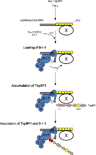 Figure 6. Summary of Rad17-mediated interaction between 9-1-1 and TopBP1 at stalled replication forks. See text for detailed discussion. |