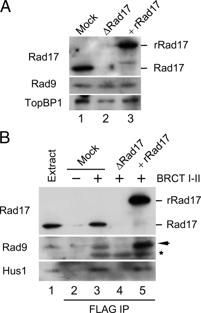 Figure 2. Rad17 regulates the interaction of 9-1-1 with TopBP1. (A) Mock-depleted (lane 1) and Rad17-depleted extracts supplemented with buffer (lane 2) or recombinant Rad17 (rRad17; lane 3) were immunoblotted for the indicated proteins. (B) The indicated extracts from A were incubated in the absence (lane 2) or presence of the FLAG-tagged BRCT I–II fragment of TopBP1 (lanes 3–5) for 1 h with anti-FLAG antibody beads. The beads were retrieved, and associated proteins were examined by immunoblotting with indicated antibodies. Rad9 (arrow) and the cross-reacting BRCT I–II band (asterisk) are marked. Lane 1 depicts 1.5 μl of initial egg extract. |