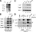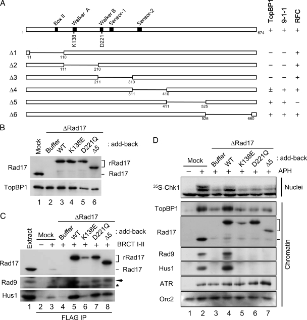 Figure 3. Rad17 regulates the chromatin accumulation of 9-1-1 and TopBP1 in an ATP-dependent manner. (A) Various constructs of Rad17 with internal deletions were generated and their binding to BRCT I–II (TopBP1), Hus1 (9-1-1), and RFC40 (RFC) was examined (see Supplemental Figure 1A). Binding of Rad17 to the indicated proteins is indicated as strong (+), weak (±), or negligible (−). (B) Mock-depleted (lane 1) and Rad17-depleted extracts supplemented with buffer alone (lane 2), rRad17-WT (lane 3), rRad17-K138E (lane 4), rRad17-D221Q (lane 5), or rRad17-Δ5 (lane 6) were immunoblotted for Rad17 and TopBP1. (C) The indicated extracts from B were incubated with anti-FLAG antibody beads in the absence (lane 2) or presence of the FLAG-tagged BRCT I–II fragment of TopBP1 (lanes 3–8). The beads were retrieved and immunoblotted for the indicated proteins. Lane 1 depicts 1.5 μl of initial egg extract. Rad9 (arrow) and the cross-reacting BRCT I–II band (asterisk) are marked. (D) The indicated extracts from B were incubated with sperm chromatin in the absence (lane 1) or presence of aphidicolin (lanes 2–7). Aliquots of the extracts were incubated with 35S-Chk1. Nuclear fractions from these incubations were processed for phosphorimaging (top panel). Other aliquots were processed for isolation of chromatin fractions and immunoblotting with indicated antibodies (bottom panels). |