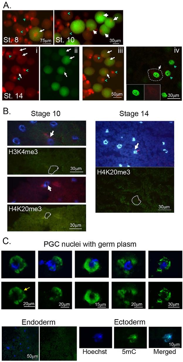 Fig. 5. Pre-neurula PGCs display permissive chromatin and histone staining. (A)ï Fluorescence stereomicroscopy of PGCs (green) and somatic cells from dissociated embryos. Cells were stained with anti-hyperacetylated Histone H4 (Penta, red), a marker of transcriptionally active chromatin. Stage 8 and 10 represent merged images of Penta immunostaining and DiOC6 labeling (green). Stage 14: (i) Penta alone, (ii) DiOC6, (iii) merged image, (iv) merged confocal image showing Penta staining (green) and a PGC (outlined) identified by Xnos1 (red) immunostaining. (insets show separate images). Examples of PGCs (white arrows) and endoderm cells (green arrowheads) with nuclear staining. Both PGCs and somatic cells express Histone H4 Penta at every stage. (B)ï Cryostat sections from stages 10 and 14 showing the endodermal region immunostained for H4K20me3 or H3K4me3 (green). PGCs indicated by Xnos1 immunostaining (red); nuclei stained with Hoechst (blue). PGCs (white arrows), other nuclei from endoderm cells. PGC nuclei are outlined. No nuclear staining was detected for any of the histone methylated lysines tested (see Materials and methods). (C)ï Stage 10 isolated PGC and endoderm nuclei (blue) immunostained for 5mC (green). Both cell types were demethylated on cytosine residues. DiOC6-stained germ plasm remained associated with PGC nuclei (arrow). 5mC staining of ectoderm nuclei served as a